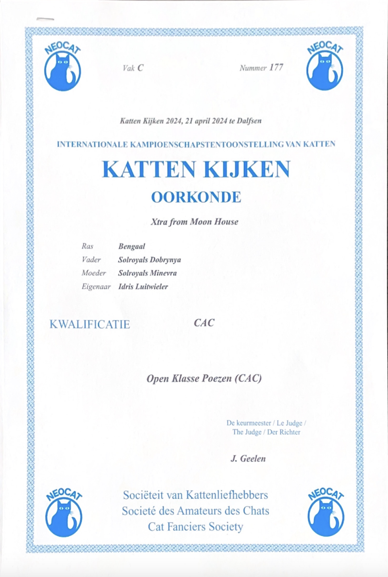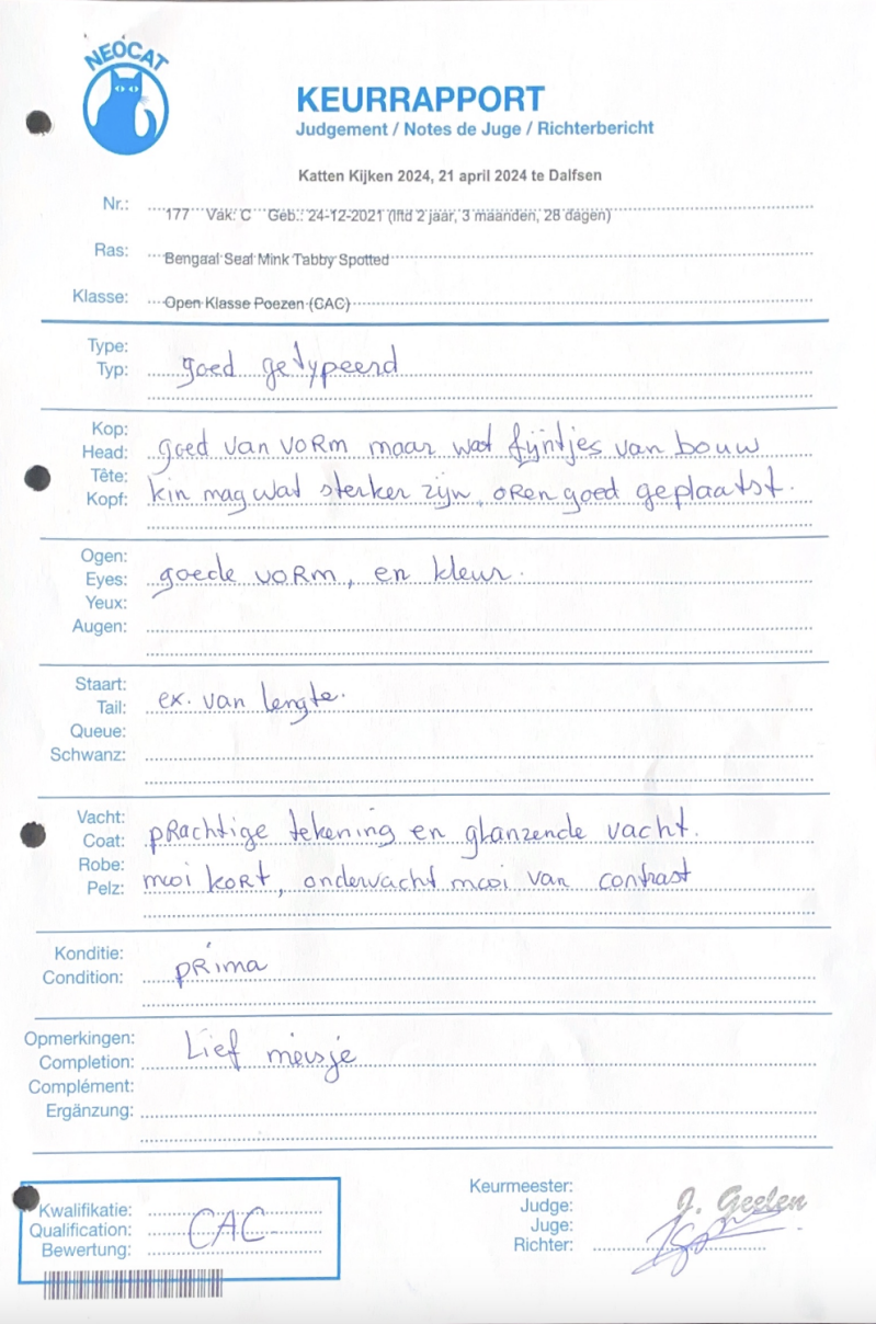 Ook de keurrapporten zijn we onwijs blij mee. Beide dames kregen EX1. Oftewel: van hun kleur, zijn zij de beste. Excellent! Nu hebben ze allebei 2 punten voor hun kampioenstitel. Nog eentje te gaan en we mogen ze registreren als Champion (Ch.). De volgende show staat al in de agenda (Nijmegen, Neocat), dus hopelijk gaan we daar net zo positief heen én weer terug.